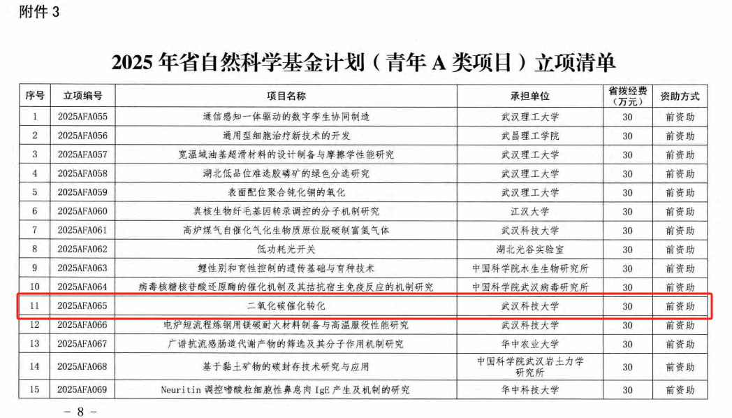 近日,湖北省科技厅印发《关于下达2025年省自然科学基金计划项目的通知》(鄂科技发资〔2025〕3号),公布获批立项的2025年湖北省自然科学基金各类项目。武汉科技大学威廉官网中国官方网站刘国亮教授申报的“二氧化碳催化转化”项目成功获批青年A类项目,这是刘国亮教授在可持续能源催化领域深耕多年取得的又一重要科研突破。