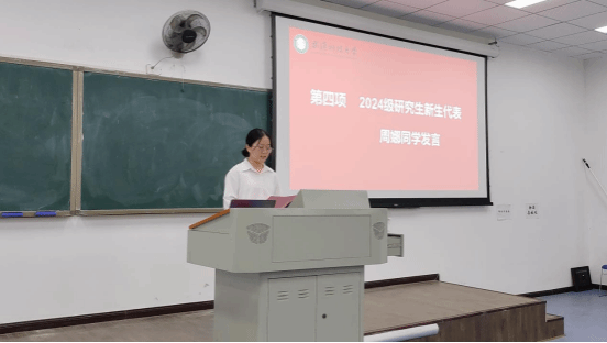 心向往之,行必能至。2024级研究生新生代表周娜分享了自己作为一名科研路上新的追梦人,良好的科研素养与态度、优秀的团队合作意识、突出的个人综合素质对于在未来科研道路我们成长的重要性,鼓励同学们坚定信念,勇敢探索,注重实践与创新。