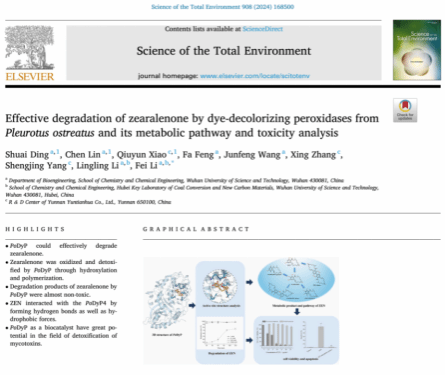 近日,威廉官网中国官方网站生物工程专业2020级本科生丁帅、林晨在环境类领域SCI期刊Science of the Total Environment (中科院1区TOP期刊)分别以第一作者和共同第一作者身份在线发表题为“Effective degradation of zearalenone by dye-decolorizing peroxidases from Pleurotus ostreatus and its metabolic pathway and toxicity analysis”的研究论文(Science of The Total Environment,2024,908:168500)。生物工程系李飞特聘教授为论文指导老师、通讯作者。武汉科技大学为该论文第一单位。本研究获得国家自然科学基金(32000067)、湖北省人才引进项目(2022),2023年度武汉市知识创新专项项目(曙光计划)和武汉科技大学人才引进项目 (No. 105005901)的资助。