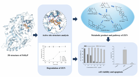 真菌毒素玉米赤霉烯酮(ZEN)在谷类作物和饲料中被广泛检出,对人类和动物都构成了重大威胁。探索安全有效的方法来降低玉米赤霉烯酮污染对食品和农业安全至关重要。本研究中,作者筛选并异源表达了一种来自白腐真菌糙皮侧耳的染料脱色过氧化物酶(PoDyP4),发现其对ZEN降解具有显著的效果,即使在1 mM高浓度ZEN下,也能几乎完全降解ZEN。进一步对其降解机制分析表明PoDyP4通过羟基化和聚合反应新策略等两种途径实现对ZEN的脱毒。相比未处理的ZEN,PoDyP处理后的ZEN降解产物对小鼠精母细胞GC-2细胞毒性显著下降。分子对接表明疏水作用力和氢键对ZEN-PoDyP4的稳定性至关重要。本研究进一步开发了高效的玉米赤霉烯酮降解酶,在食品和农业领域中真菌毒素的降解具有潜在的应用前景,对世界粮食安全和经济社会的可持续发展具有重要意义。