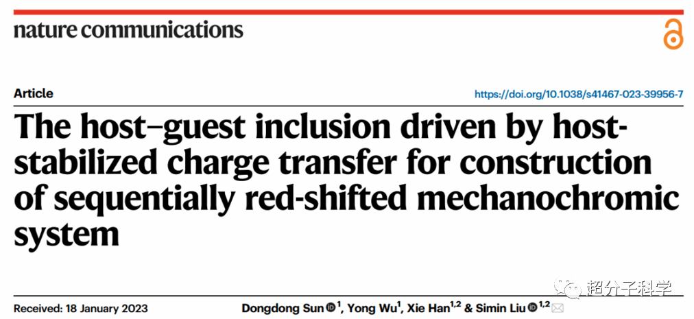 武科大网讯(通讯员吴蔓玲)近日,我校威廉官网中国官方网站刘思敏教授团队在顶级期刊《自然·通讯》发表了题为“The host-guest inclusion driven by host-stabilized charge transfer for construction of sequentially red-shifted mechanochromic system”的研究论文。博士生孙冬冬为第一作者,刘思敏为通讯作者,论文第一单位为我校威廉官网中国官方网站。