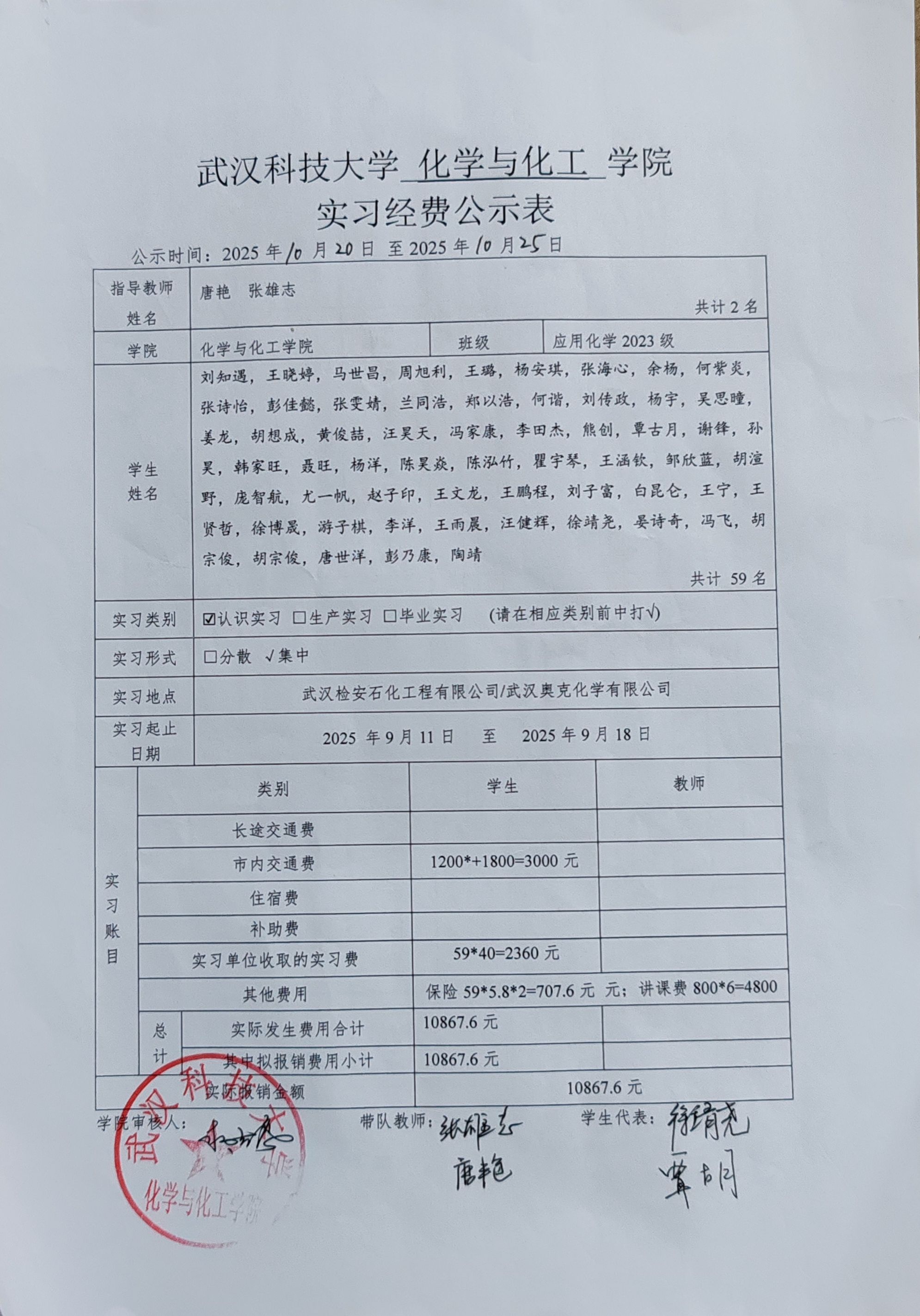应用化学2023级认识实习经费公示